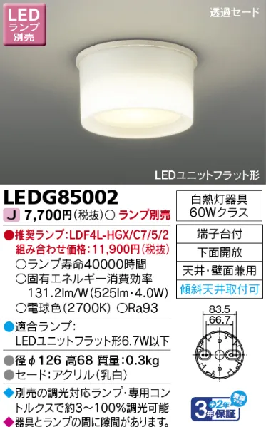 東芝ライテック シーリング LED小シーリングランプ別売 LEDG85002