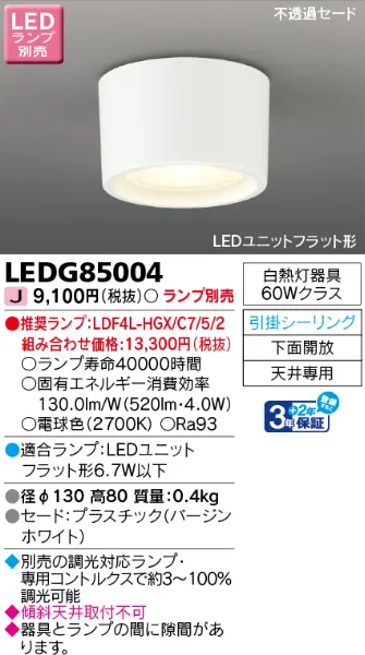 東芝ライテック シーリング LED小シーリングランプ別売 LEDG85004