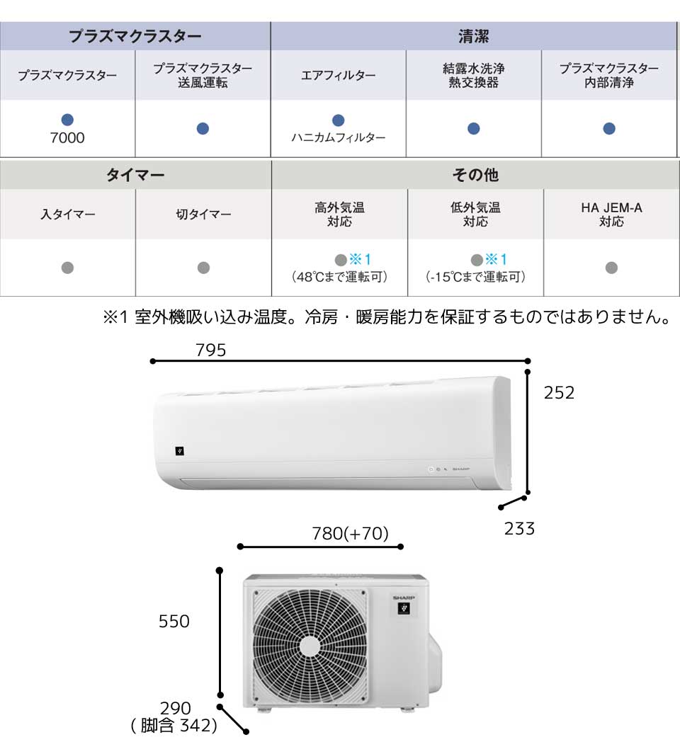 室内機品番 AY-T28DH 室外機品番 AU-T28DHY 室内機寸法(質量) H252×W795×D233mm(約10kg) 室外機寸法(質量) H550×W780(+配管カバー部70)×D290(脚含342)mm(約29kg)