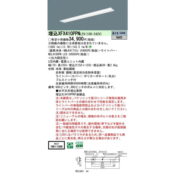 パナソニック 施設照明器具 LEDベースライト 天井埋込型 一体型 XFX410PPNLE9