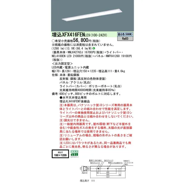 パナソニック 施設照明器具 LEDベースライト 天井埋込型 一体型 XFX416FENLE9