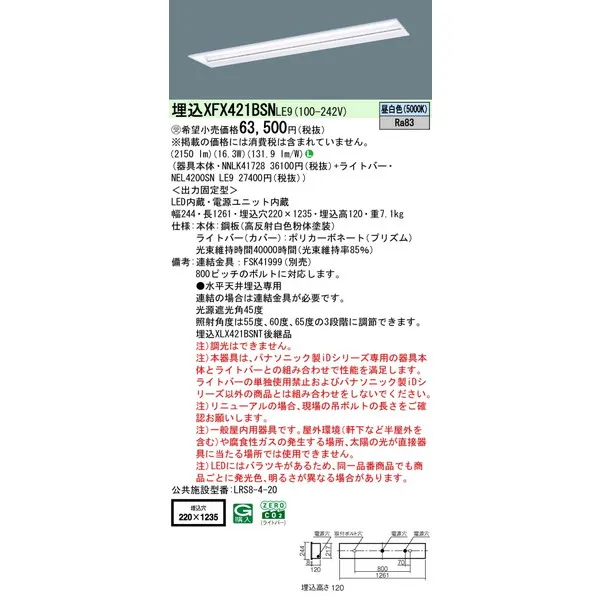 パナソニック 施設照明器具 LEDベースライト 天井埋込型 一体型 XFX421BSNLE9