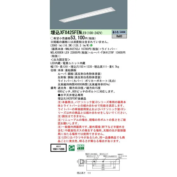 パナソニック 施設照明器具 LEDベースライト 天井埋込型 一体型 XFX425FENLE9