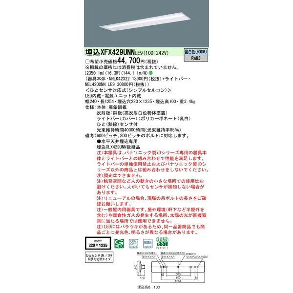 パナソニック 施設照明器具 LEDベースライト 天井埋込型 一体型 XFX429UNNLE9