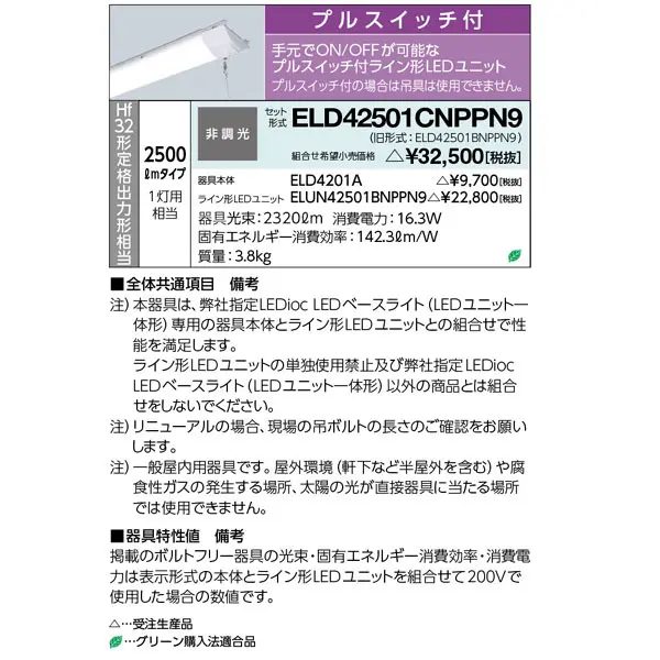 岩崎電気 LEDベースライト 40W形 直付形 W250 昼白色 Hf32形定格出力形相当 プルスイッチ付 ELD42501CNPPN9