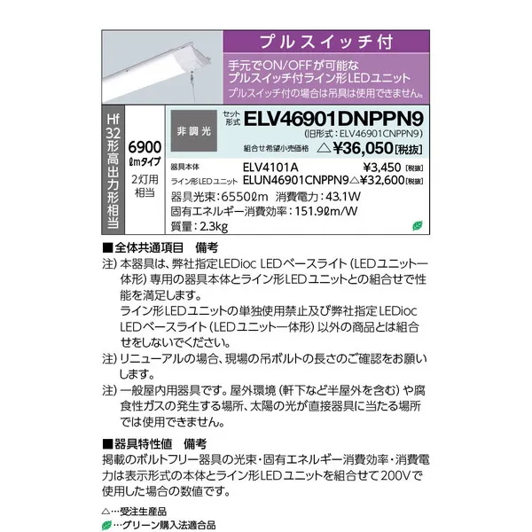 岩崎電気 LEDベースライト 天井直付型一体型 ELV46901DNPPN9