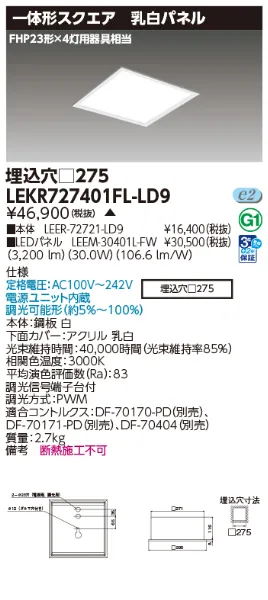 定格電圧 100V~242V 埋め込みサイズ □:275 mm 質量 2.7 kg 調光方式 PWM制御 調光範囲 約5%~100% 光色(相関色温度、平均演色評価数) 電球色(3000K Ra:83) 光束維持時間 40,000時間(光束維持率85%) 器具光束 3200 lm 定格消費電力 30.5W(100V) 30.0W(200V) 30.0W(242V) 入力電流 306mA(100V) 155mA(200V) 131mA(242V) エネルギー消費効率 104.9lm/W(100V) 106.6lm/W(200V) 106.6lm/W(242V) 周波数 50/60Hz 付加機能 調光タイプ 材質 本体鋼板白/下面カバーアクリル乳白 始動電圧 LD9 補助点灯装置 電源ユニット内蔵 調光可能形(約5%~100%) 備考 断熱施工不可