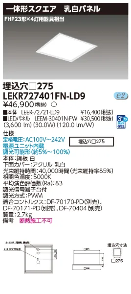 東芝ライテック LEDベースライト ベースライト埋込□275乳白 LEKR727401FN-LD9