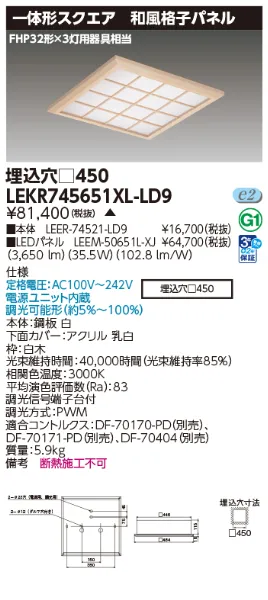 定格電圧 100V~242V 器具幅 □:484 mm 埋め込みサイズ □:450 mm 質量 5.9 kg 調光方式 PWM制御 調光範囲 約5%~100% 光色(相関色温度、平均演色評価数) 電球色(3000K Ra:83) 光束維持時間 40,000時間(光束維持率85%) 器具光束 3650 lm 定格消費電力 36.5W(100V) 35.5W(200V) 35.5W(242V) 入力電流 368mA(100V) 190mA(200V) 162mA(242V) エネルギー消費効率 100lm/W(100V) 102.8lm/W(200V) 102.8lm/W(242V) 周波数 50/60Hz 付加機能 調光タイプ 材質 本体鋼板白/下面カバーアクリル乳白/枠白木 始動電圧 LD9 補助点灯装置 電源ユニット内蔵 調光可能形(約5%~100%) 備考 断熱施工不可