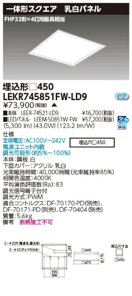 東芝ライテック LEDベースライト ベースライト埋込□450乳白 LEKR745851FW-LD9