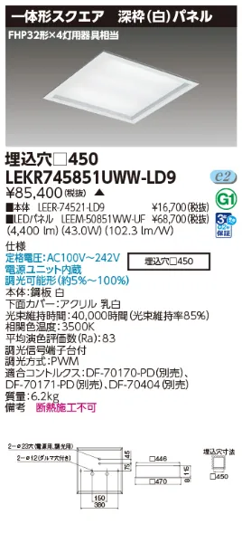 定格電圧 100V~242V 器具幅 □:470 mm 埋め込みサイズ □:450 mm 質量 6.2 kg 調光方式 PWM制御 調光範囲 約5%~100% 光色(相関色温度、平均演色評価数) 温白色(3500K Ra:83) 光束維持時間 40,000時間(光束維持率85%) 器具光束 4400 lm 定格消費電力 44.5W(100V) 43.0W(200V) 43.0W(242V) 入力電流 448mA(100V) 227mA(200V) 193mA(242V) エネルギー消費効率 98.8lm/W(100V) 102.3lm/W(200V) 102.3lm/W(242V) 周波数 50/60Hz 付加機能 調光タイプ 材質 本体鋼板白/下面カバーアクリル乳白 始動電圧 LD9 補助点灯装置 電源ユニット内蔵 調光可能形(約5%~100%) 備考 断熱施工不可