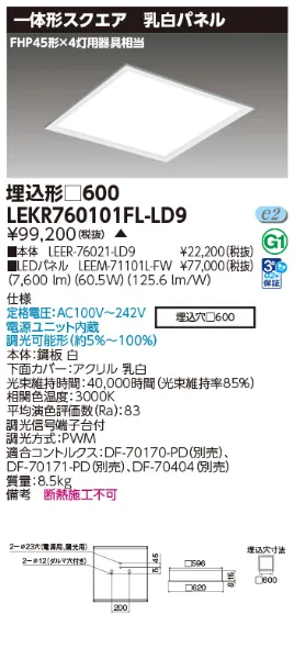 定格電圧 100V~242V 器具幅 □:620 mm 埋め込みサイズ □:600 mm 質量 8.5 kg 調光方式 PWM制御 調光範囲 約5%~100% 光色(相関色温度、平均演色評価数) 電球色(3000K Ra:83) 光束維持時間 40,000時間(光束維持率85%) 器具光束 7600lm 定格消費電力 62.5W(100V) 60.5W(200V) 60.5W(242V) 入力電流 627mA(100V) 313mA(200V) 265mA(242V) エネルギー消費効率 121.6lm/W(100V) 125.6lm/W(200V) 125.6lm/W(242V) 周波数 50/60Hz 付加機能 調光タイプ 材質 本体鋼板白/下面カバーアクリル乳白 始動電圧 LD9 補助点灯装置 電源ユニット内蔵 調光可能形(約5%~100%) 備考 断熱施工不可