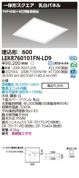 定格電圧 100V~242V 器具幅 □:620 mm 埋め込みサイズ □:600 mm 質量 8.5 kg 調光方式 PWM制御 調光範囲 約5%~100% 光色(相関色温度、平均演色評価数) 昼白色(5000K Ra:83) 光束維持時間 40,000時間(光束維持率85%) 器具光束 8500 lm 定格消費電力 62.5W(100V) 60.5W(200V) 60.5W(242V) 入力電流 627mA(100V) 313mA(200V) 265mA(242V) エネルギー消費効率 136lm/W(100V) 140.4lm/W(200V) 140.4lm/W(242V) 公共施設品番 LRS4F1-6-84