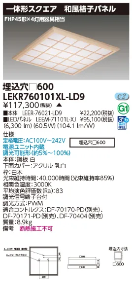 定格電圧 100V~242V 器具幅 □:634 mm 埋め込みサイズ □:600 mm 質量 8.9 kg 調光方式 PWM制御 調光範囲 約5%~100% 光色(相関色温度、平均演色評価数) 電球色(3000K Ra:83) 光束維持時間 40,000時間(光束維持率85%) 器具光束 6300 lm 定格消費電力 62.5W(100V) 60.5W(200V) 60.5W(242V) 入力電流 627mA(100V) 313mA(200V) 265mA(242V) エネルギー消費効率 100.8lm/W(100V) 104.1lm/W(200V) 104.1lm/W(242V) 周波数 50/60Hz 付加機能 調光タイプ 材質 本体鋼板白/下面カバーアクリル乳白 始動電圧 LD9 補助点灯装置 電源ユニット内蔵 調光可能形(約5%~100%) 備考 断熱施工不可