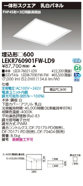 定格電圧 100V~242V 器具幅 □:620 mm 埋め込みサイズ □:600 mm 質量 8.5 kg 調光方式 PWM制御 調光範囲 約5%~100% 光色(相関色温度、平均演色評価数) 白色(4000K Ra:83) 光束維持時間 40,000時間(光束維持率85%) 器具光束 7000lm 定格消費電力 54.0W(100V) 52.0W(200V) 52.0W(242V) 入力電流 542mA(100V) 271mA(200V) 230mA(242V) エネルギー消費効率 129.6lm/W(100V) 134.6lm/W(200V) 134.6lm/W(242V) 周波数 50/60Hz 付加機能 調光タイプ 材質 本体鋼板白/下面カバーアクリル乳白 始動電圧 LD9 補助点灯装置 電源ユニット内蔵 調光可能形(約5%~100%) 備考 断熱施工不可