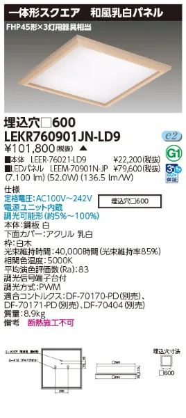 定格電圧 100V~242V 器具幅 □:634 mm 埋め込みサイズ □:600 mm 質量 8.9 kg 調光方式 PWM制御 調光範囲 約5%~100% 光色(相関色温度、平均演色評価数) 昼白色(5000K Ra:83) 光束維持時間 40,000時間(光束維持率85%) 器具光束 7100 lm 定格消費電力 54.0W(100V) 52.0W(200V) 52.0W(242V) 入力電流 542mA(100V) 271mA(200V) 230mA(242V) エネルギー消費効率 131.4lm/W(100V) 136.5lm/W(200V) 136.5lm/W(242V) 周波数 50/60Hz 付加機能 調光タイプ 材質 本体鋼板白/下面カバーアクリル乳白 始動電圧 LD9 補助点灯装置 電源ユニット内蔵 調光可能形(約5%~100%) 備考 断熱施工不可