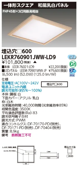 定格電圧 100V~242V 器具幅 □:634 mm 埋め込みサイズ □:600 mm 質量 8.9 kg 調光方式 PWM制御 調光範囲 約5%~100% 光色(相関色温度、平均演色評価数) 温白色(3500K Ra:83) 光束維持時間 40,000時間(光束維持率85%) 器具光束 6500 lm 定格消費電力 54.0W(100V) 52.0W(200V) 52.0W(242V) 入力電流 542mA(100V) 271mA(200V) 230mA(242V) エネルギー消費効率 120.3lm/W(100V) 125lm/W(200V) 125lm/W(242V) 周波数 50/60Hz 付加機能 調光タイプ 材質 本体鋼板白/下面カバーアクリル乳白 始動電圧 LD9 補助点灯装置 電源ユニット内蔵 調光可能形(約5%~100%) 備考 断熱施工不可
