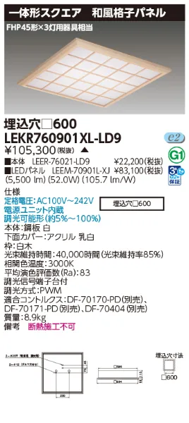 定格電圧 100V~242V 器具幅 □:634 mm 埋め込みサイズ □:600 mm 質量 8.9 kg 調光方式 PWM制御 調光範囲 約5%~100% 光色(相関色温度、平均演色評価数) 電球色(3000K Ra:83) 光束維持時間 40,000時間(光束維持率85%) 器具光束 5500 lm 定格消費電力 54.0W(100V) 52.0W(200V) 52.0W(242V) 入力電流 542mA(100V) 271mA(200V) 230mA(242V) エネルギー消費効率 101.8lm/W(100V) 105.7lm/W(200V) 105.7lm/W(242V) 周波数 50/60Hz 付加機能 調光タイプ 材質 本体鋼板白/下面カバーアクリル乳白 始動電圧 LD9 補助点灯装置 電源ユニット内蔵 調光可能形(約5%~100%) 備考 断熱施工不可