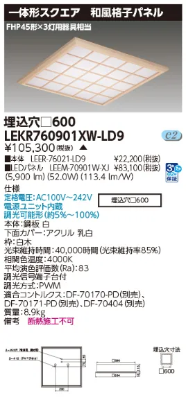定格電圧 100V~242V 器具幅 □:634 mm 埋め込みサイズ □:600 mm 質量 8.9 kg 調光方式 PWM制御 調光範囲 約5%~100% 光色(相関色温度、平均演色評価数) 白色(4000K Ra:83) 光束維持時間 40,000時間(光束維持率85%) 器具光束 5900 lm 定格消費電力 54.0W(100V) 52.0W(200V) 52.0W(242V) 入力電流 542mA(100V) 271mA(200V) 230mA(242V) エネルギー消費効率 109.2lm/W(100V) 113.4lm/W(200V) 113.4lm/W(242V) 周波数 50/60Hz 付加機能 調光タイプ 材質 本体鋼板白/下面カバーアクリル乳白 始動電圧 LD9 補助点灯装置 電源ユニット内蔵 調光可能形(約5%~100%) 備考 断熱施工不可