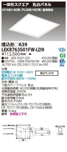 東芝ライテック LEDベースライト □639乳白W色 LEKR763501FW-LD9