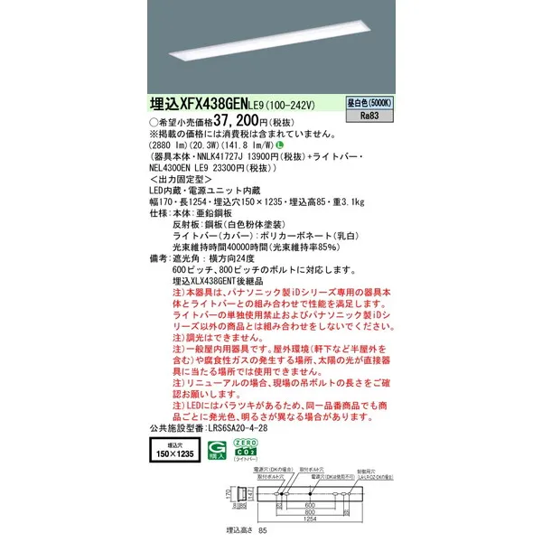 パナソニック 施設照明器具 LEDベースライト 天井埋込型 一体型 XFX438GENLE9