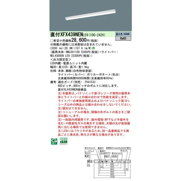 パナソニック iスタイル LEDベースライト 天井直付型 一体型 XFX439NENLE9 リニューアル用 40形