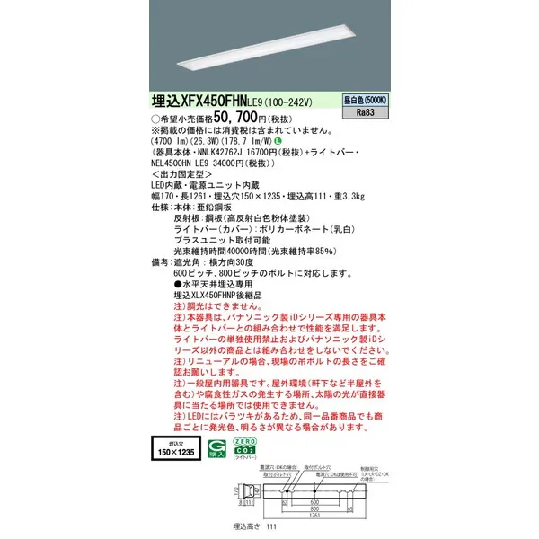 パナソニック 施設照明器具 LEDベースライト 天井埋込型 一体型 XFX450FHNLE9