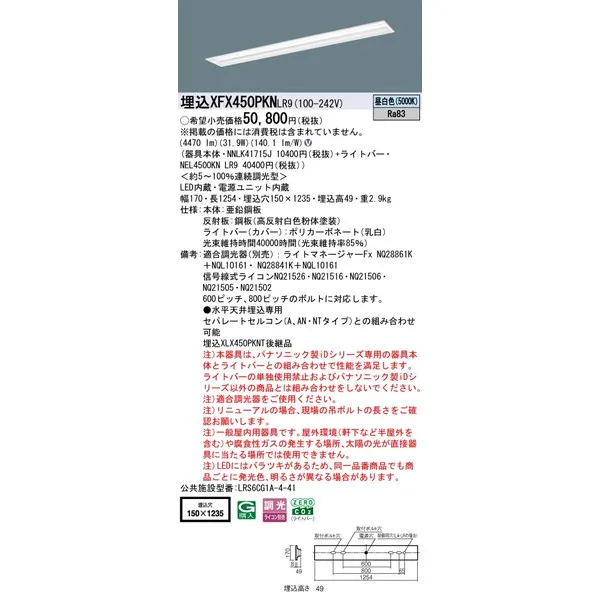パナソニック 施設照明器具 LEDベースライト 天井埋込型 一体型 XFX450PKNLR9
