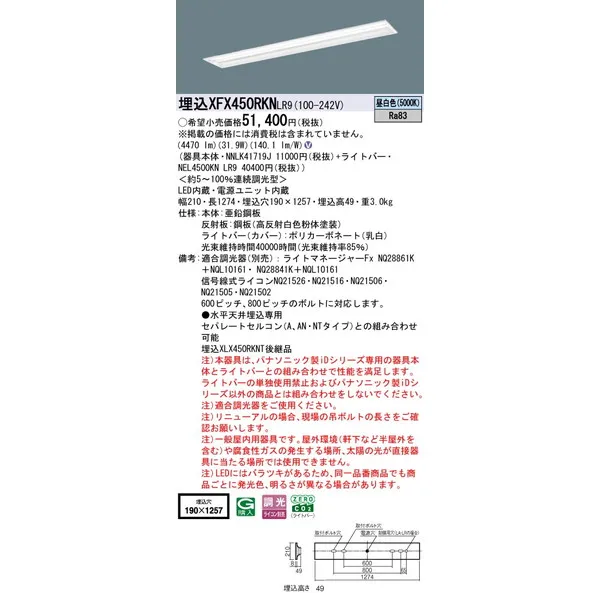 パナソニック 施設照明器具 LEDベースライト 天井埋込型 一体型 XFX450RKNLR9