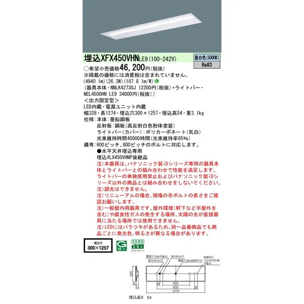 パナソニック 施設照明器具 LEDベースライト 天井埋込型 一体型 XFX450VHNLE9