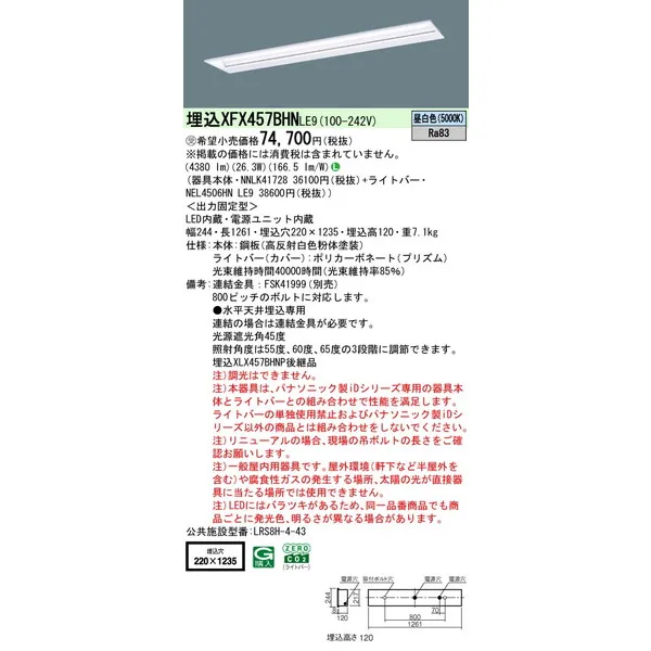 パナソニック 施設照明器具 LEDベースライト 天井埋込型 一体型 XFX457BHNLE9