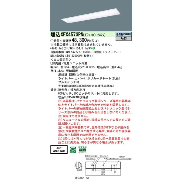 パナソニック 施設照明器具 LEDベースライト 天井埋込型 一体型 XFX457GPNLE9