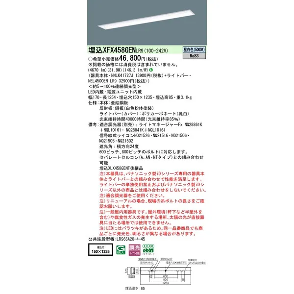 パナソニック 施設照明器具 LEDベースライト 天井埋込型 一体型 XFX458GENLR9