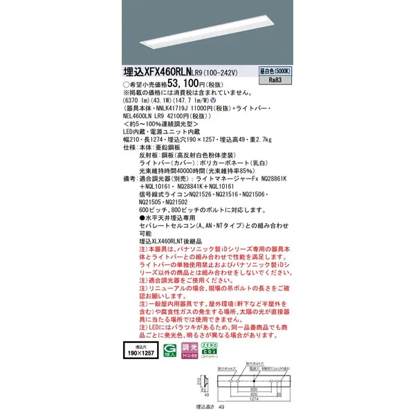 パナソニック 施設照明器具 LEDベースライト 天井埋込型 一体型 XFX460RLNLR9