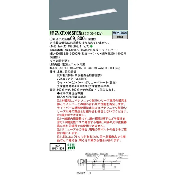 パナソニック 施設照明器具 LEDベースライト 天井埋込型 一体型 XFX466FENLE9