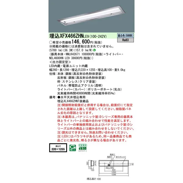 パナソニック 施設照明器具 LEDベースライト 天井埋込型 一体型 XFX466ZHNLE9