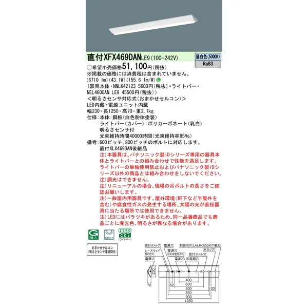 パナソニック LEDベースライト 天井直付型 一体型 XFX469DANLE9
