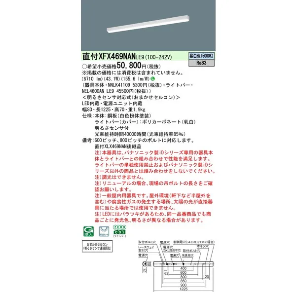 パナソニック LEDベースライト 天井直付型 一体型 XFX469NANLE9 リニューアル用