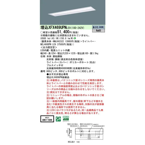 パナソニック 施設照明器具 LEDベースライト 天井埋込型 一体型 XFX469UPNLE9