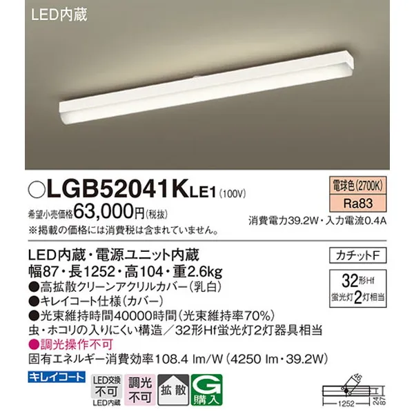 パナソニック 施設照明器具 LEDベースライト 天井直付型 一体型 LGB52041KLE1