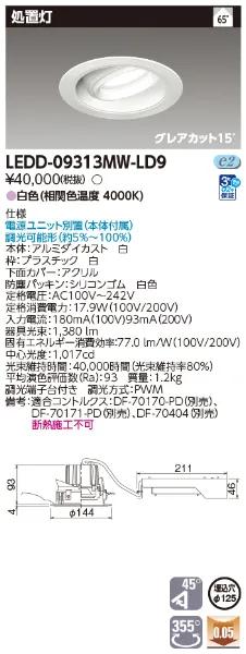 定格電圧 100V~242V 器具幅 φ:144 mm 埋め込みサイズ φ:125 mm 質量 1.2 kg 調光方式 PWM制御 調光範囲 約5%~100% 光色(相関色温度、平均演色評価数) 白色(4000K Ra:93) 光束維持時間 40,000時間(光束維持率85%) 器具光束 1380 lm 定格消費電力 17.9W(100V) 17.9W(200V) 18.2W(242V) 入力電流 180mA(100V) 93mA(200V) 81mA(242V) エネルギー消費効率 77lm/W(100V) 77lm/W(200V) 75.8lm/W(242V) 保護等級 保護等級:IP20 配光角タイプ 広角タイプ 遮光角 20° 周波数 50/60Hz 配光角 65度 付加機能 調光タイプ