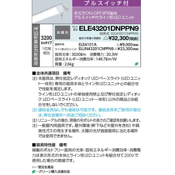 岩崎電気 LEDベースライト 埋込下面開放形 W150 プルスイッチ付 ELE43201DNPPN9