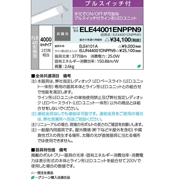 岩崎電気 LEDベースライト 埋込下面開放形 W150 プルスイッチ付 ELE44001ENPPN9