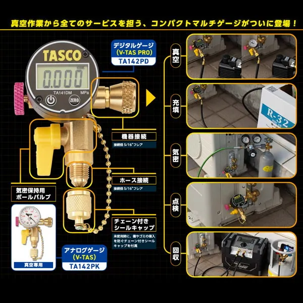 接続ポート 5/16”フレア バルブ ボールバルブ 圧力範囲 -0.1~5MPa 電源 電池式(3V リチウム電池CR2450) 機能 真空・充填・気密・点検・回収