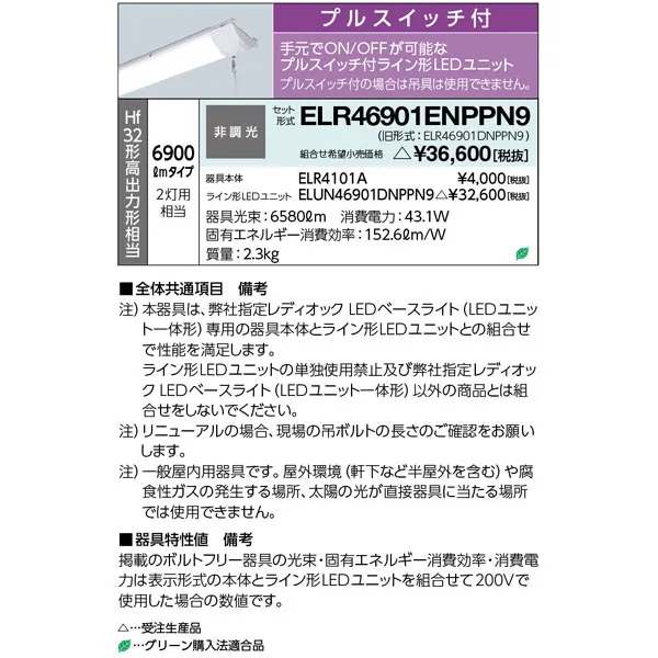 岩崎電気 LEDベースライト 40W形 笠付形 昼白色Hf32形高出力形相当 プルスイッチ付 ELR46901ENPPN9