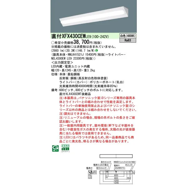 パナソニック iDシリーズ 天井直付型 40形 一体型LEDベースライト コーナーライト XFX430CEWLE9 白色(4000K)