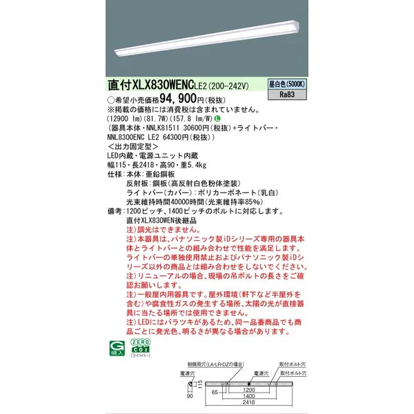 パナソニック iDシリーズ 天井直付型 110形 一体型LEDベースライト ウォールウォッシャ XLX830WENCLE2 昼白色(5000K)