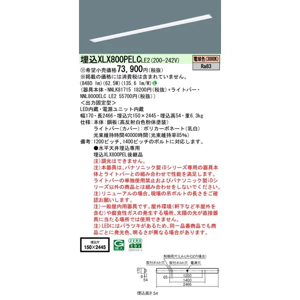 パナソニック iDシリーズ 天井埋込型 110形 一体型LEDベースライト 下面開放型 W150 XLX800PELCLE2 電球色(3000K)