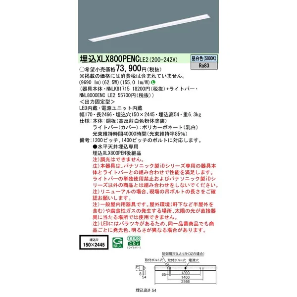 パナソニック iDシリーズ 天井埋込型 110形 一体型LEDベースライト 下面開放型 W150 XLX800PENCLE2 昼白色(5000K)