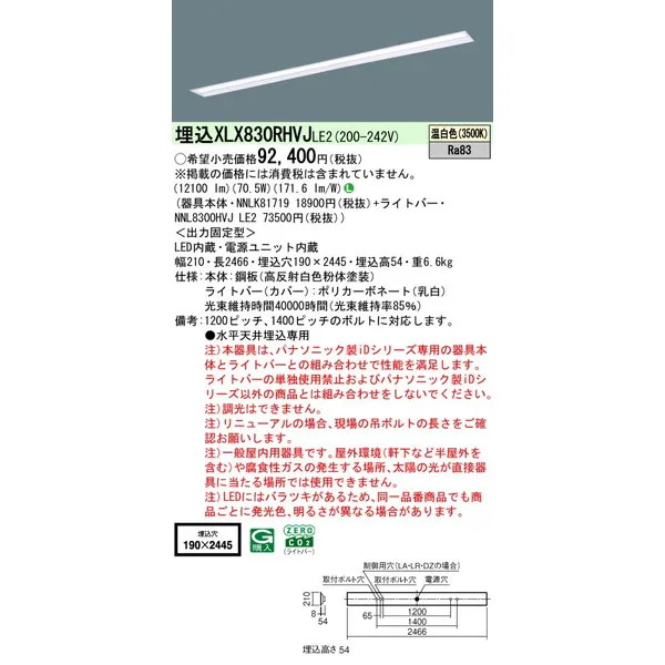 パナソニック iDシリーズ 天井埋込型 110形 一体型LEDベースライト 下面開放型 W190 XLX830RHVJLE2 温白色(3500K)